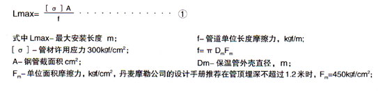 褡補(bǔ)償器(包括轉(zhuǎn)角處自然補(bǔ)償器)至固定點(diǎn)之間的距離不得_管道的_安裝長(zhǎng)度Lmax,管道_安裝長(zhǎng)度的定義是固定點(diǎn)至自由端(補(bǔ)償器)的長(zhǎng)度,在此長(zhǎng)度下產(chǎn)生的摩擦力不得_管道許用應(yīng)力下相應(yīng)的彈性力。