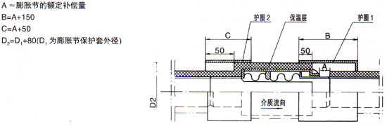 直埋式膨脹節(jié)(不包括一次性直埋式)安裝時(shí)應(yīng)有兩個(gè)后年度護(hù)圈(如下圖),且護(hù)圈的壁厚不應(yīng)小于管道的壁厚,設(shè)置護(hù)圈1的目的是為管道受熱膨脹時(shí),A尺寸范圍內(nèi)有土、砂等進(jìn)入,圖中的各尺寸為: