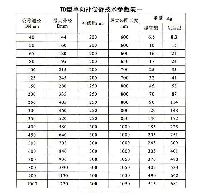 1、TD型單向補償器技術參數見表1,結構型式見圖一。