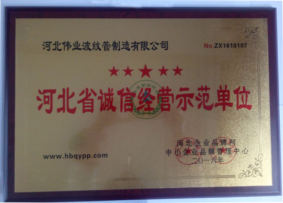 為貫徹落實誠信建設的要求,深入推進誠信河北建設,經(jīng)過各縣、市(區(qū))和市本級行業(yè)協(xié)會的推薦、初審,并經(jīng)有關部門審查把關,河北偉業(yè)波紋管制造有限公司榮獲“2016年度河北省誠信經(jīng)營示范單位”獎。